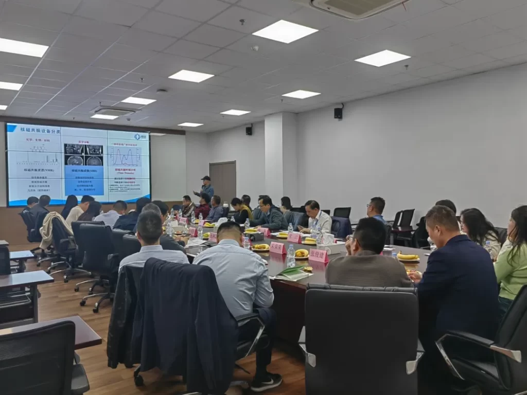 返回会议室后,产品部刘经理向与会的企业家们作了题为《低场核磁共振技术在材料领域的应用》的专题汇报。刘经理指出,低场核磁技术具备快速测量(单样仅需1–2分钟)、原位无损等核心优势,能够良好适配研发与质量管控等场景,有效弥补传统检测方法在效率方面的不足。目前,开云足球已形成包括颗粒表面特性分析仪、核磁共振变温分析仪以及多通道全自动工业检测设备在内的系列化产品,满足了市场多样化的测试需求。