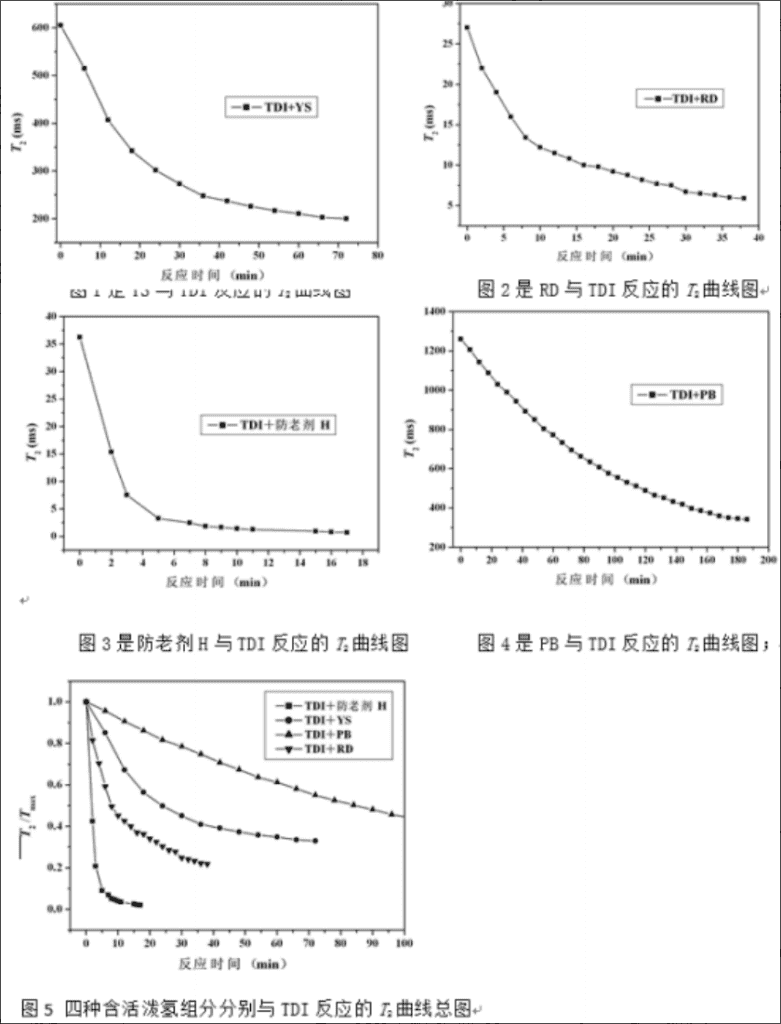 1) 获得TDI与四种含活泼氢组分的反应活性顺序为:防老剂H > RD > YS > PB。
