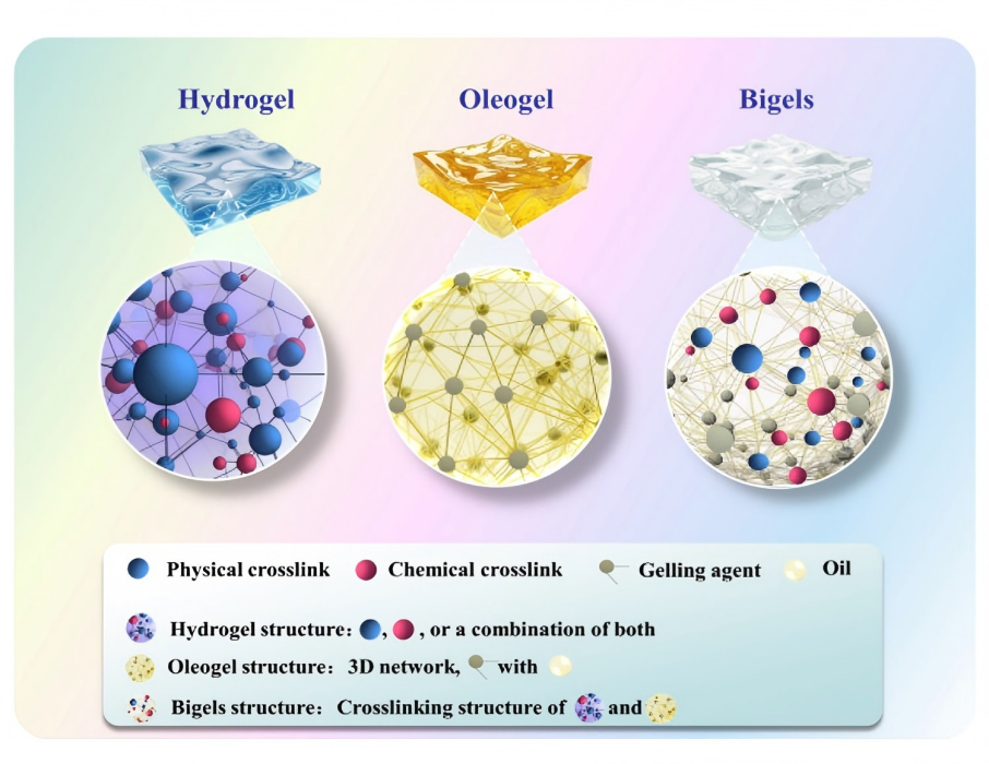 1、结构设计对比: 系统比较双连续型双凝胶与单相包裹型双凝胶(水包油OG-in-HG或油包水HG-in-OG)在结构性能上的差异。