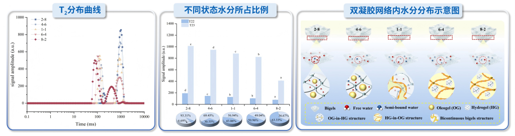 1、双凝胶样品包括半结合水和自由水,油凝胶和水凝胶比例的变化会影响水的流动性和双凝胶中水类型的分布;