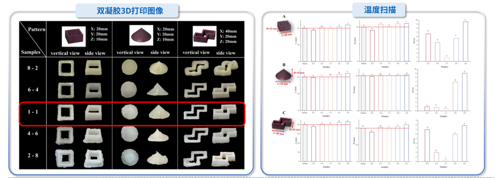 1、双连续结构双凝胶显示出最好的打印性能,既适用于小面积单层结构模型(如椎体),也适用于三维堆叠模型(如空心立方体)。双连续结构双凝胶样品的高度和长度与目标形状非常吻合,无显著差异,变形率小于1%。