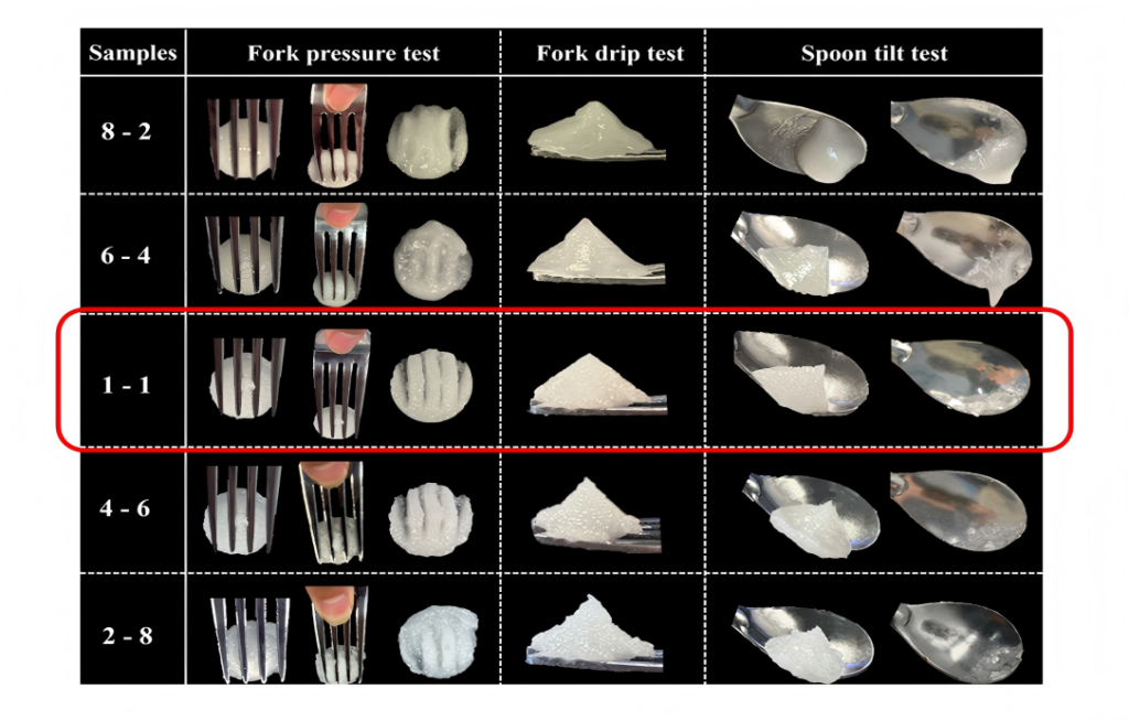 3、性能关联: 将低场核磁共振(LF-NMR)获得的水分状态、油水分布数据,与流变学测试结果以及吞咽障碍国际标准IDDSI(通过倾斜试验、叉压测试验证)进行关联。