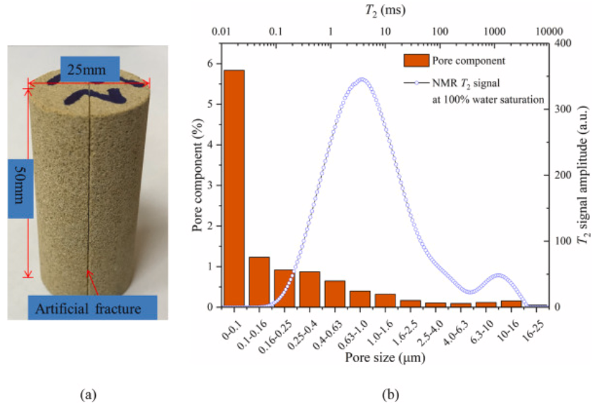 图一左为岩样,中间为人造裂缝,用于填充注浆材料,图一右为核磁表征的孔径分布。