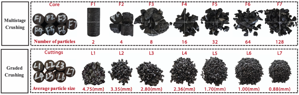 样品前处理:渐进破碎组:将完整岩心破碎成不规则颗粒,且颗粒尺寸按几何级数减小;分级破碎组:从一个完整的煤块中钻取一个岩心柱,剩余材料被破碎并筛分成不同的粒径级别。