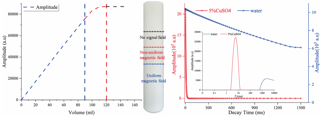 射频线圈的检测区域特性:图2(a)表明,LF-NMR装置中射频线圈的检测区域分为均匀磁场区和非均匀磁场区。在均匀区域内,信号幅度与液体体积呈线性比例关系;而在非均匀区域,这种关系变为非线性,当液体超过一定液位后信号达到最大值并趋于平稳。