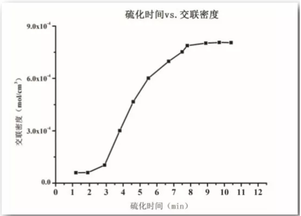 上图实验是橡胶样品在Tg+150℃的测试条件下,此时完全去掉了分子间的作用力,可以完全反应交联密度(物理交联和化学交联)随硫化时间的变化。