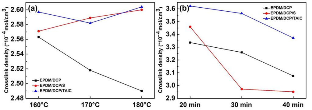 温度、时间和硫化剂类型对EPDM橡胶交联密度的影响如图2所示。如图2a所示,随着温度的逐渐升高,EPDM/DCP橡胶的交联密度逐渐降低,而EPDM/DCP/S和EPDM/DCP/TAIC的交联密度保持在相对合理的数值。一种可能的解释可能是,如S和TAIC等固化辅助剂的存在可以将C-S或C-O键引入该交联体系,以提高交联结构的完整性。此外,在EPDM橡胶中,在长时间高温条件下,C-S、C-C和C-O键断裂,导致EPDM橡胶的交联密度降低。因此,EPDM橡胶的最佳固化温度为160℃。随着时间的增加,EPDM橡胶的交联密度呈持续下降趋势,其中EPDM/DCP/S的交联密度下降最快(图2b)。C-S、C-C和C-O键的键能分别为276kJ/mol、334 kJ/mol和364 kJ/mol,其中C-S键的键能最低。在长时间的高温条件下,C-S键比其他键更容易被破坏。EPDM橡胶的最佳固化时间为20 min。当温度为160℃时,时间为20 min时,EPDM橡胶的交联密度分别达到3.336,3.459和3.622×10^-4 mol/cm^3。EPDM/DCP/S和EPDM/DCP/TAIC的交联密度均显著高于EPDM/DCP,说明S和TAIC的掺入有利于提高橡胶的交联密度。