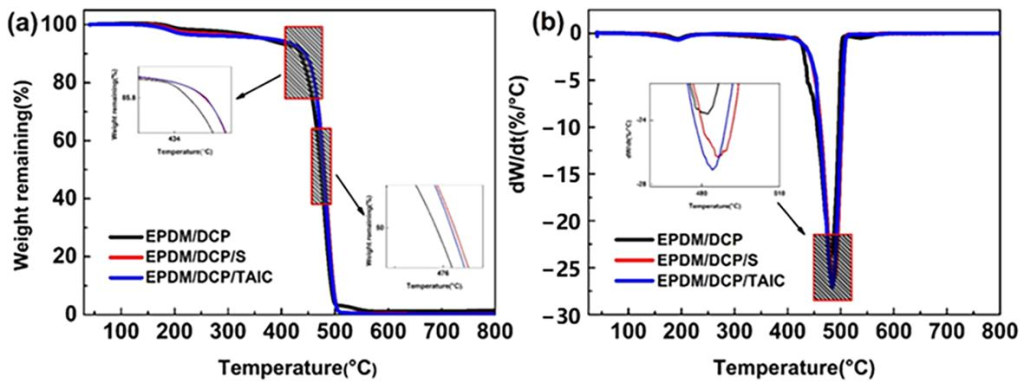 热重(TG)和差分热重(DTG)曲线EPDM橡胶的热解反应如图9a,b所示。与EPDM/DCP、Ti、EPDM/DCP/S和EPDM/DCP/TAIC的Tp和Tr均显著升高,但其含量显著升高,EPDM/DCP/S和EPDM/DCP/TAIC的炭化产率略有下降。这个EPDM/DCP/S和EPDM/DCP/TAIC比EPDM/DCP具有更高的热稳定性 。这要归因于S和TAIC的合并能提高EPDM橡胶的交联度,从而提高热性能,EPDM橡胶的稳定性。