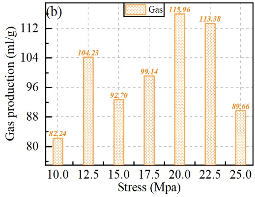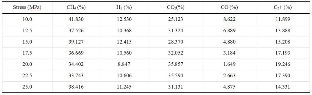 20-25.0MPa,各气体组分的产量与10-17.5MPa表现出截然相反的趋势,CO的产量随应力的增大逐渐增大,其余各类气体则逐渐减少。其中CO2产量减少13.668ml/g,CH4减少5.449ml/g,C2+烃类气体减少