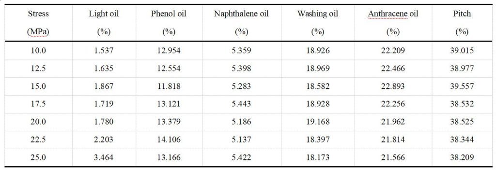 20MPa,轻油产率增大了1.608倍,而酚油、萘油、洗油、蒽油和沥青则仅为前者的0.824、0.874、0.794、