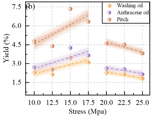 图9煤焦油各馏分产率与应力的关系(a.轻质馏分;b重质馏分)