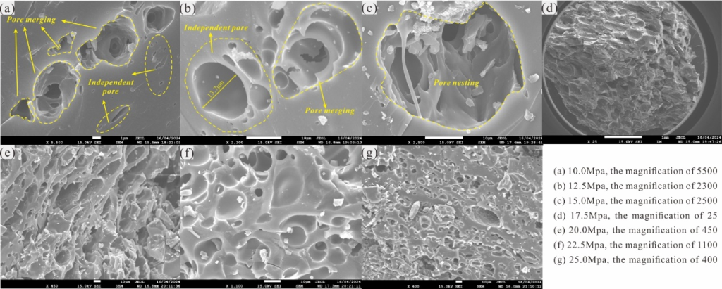 15.0MPa热解煤样中的气孔合并的现象更为显著,独立的气孔不断扩大,随后相邻的孔隙壁不断变薄甚至消失,最后孔隙之间发生合并甚至嵌套现象(图3c)。17.5MPa热解煤样中孔隙极为发育,在放大25