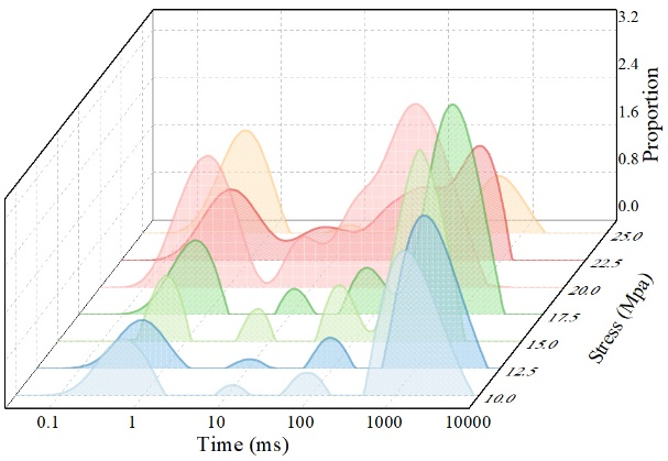 众多学者对孔径和弛豫时间的关系进行了深入研究,认为T2<3ms指示的孔隙属微孔,3ms<T2<170ms属中孔,T2>170ms属于大孔或裂缝。本研究基于此,分别计算了各煤样微孔、中孔和大孔的信号量,并通过与总信号量作比值,确定了不同应力约束下煤样各孔隙的孔径占比(图5b)。10.0-17.5MPa,各煤样的微孔占比整体偏低,中大孔占据着主导地位,占比达80%左右。此阶段,随着应力的逐渐增大,煤体逐渐发生裂解,孔隙间的连通性增强。这促进了热解过程中孔裂隙内流体对流传热效应,进而使得连通孔隙在热解过程中持续扩展,中大孔占比逐渐增加。这与孔隙表面形貌特征保持一致。在更高的应力范围下(20.0-25.0MPa),微孔占比从31.30%急剧增大到61.27%,几乎增大一倍。此应力阶段,煤体内的裂隙逐渐被压实,孔裂隙的连通性相应减弱,热解过程中孔裂隙对流传热作用亦趋减弱,连通孔隙的扩孔现象相应降低。与此同时,煤基质的热传导作用得到加强,导致煤基质中形成了众多相对较小的热解孔隙,微孔占比显著增加。