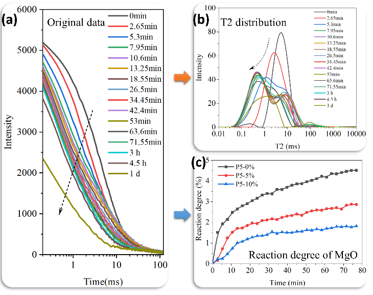 图1 LF-NMR数据的典型分析过程:从原始数据到T2时间分布和反应程度(a)横向弛豫信号;(b)T2分布;(c)MgO的反应程度
