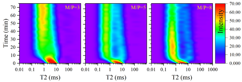 图2 在反应初始阶段M/P摩尔比对T2分布的影响
