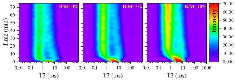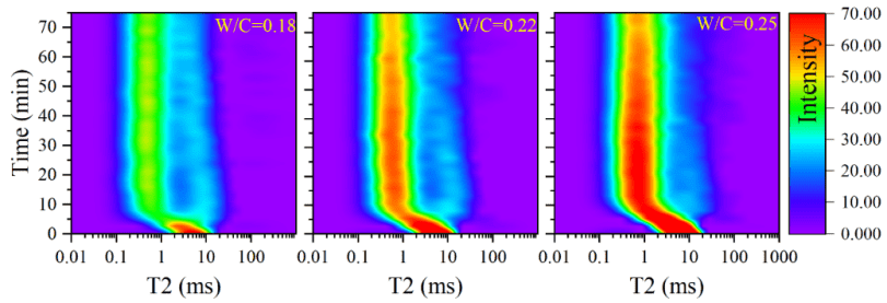 LF-NMR的主要原理是表征氢质子在自由水中的弛豫行为。不同直径孔隙中的水分子表现出不同的纵向/横向弛豫时间和弛豫信号强度。通过监测游离水向化学键合水的转化过程,也可以对胶凝材料的水化动力学进行研究。