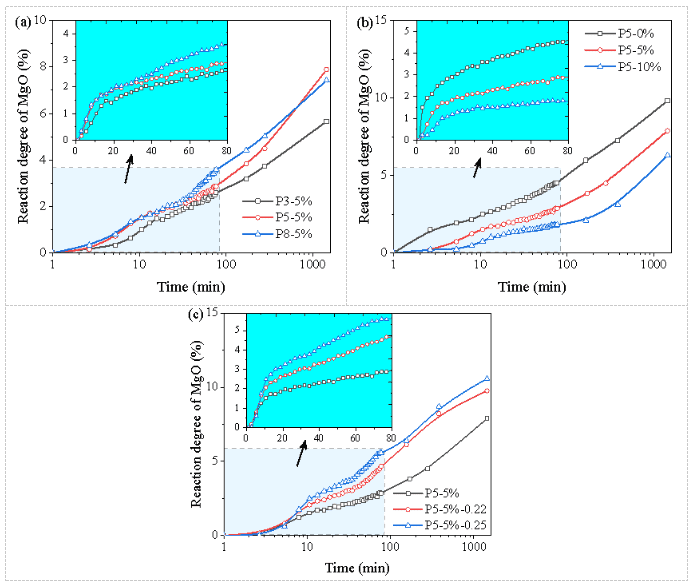 图5 MgO反应度的原位表征结果:(a)在不同M/P摩尔比的情况下;(b)在不同B/M比的情况下;(c)在不同W/C比的情况下