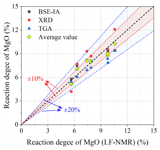X轴为由LF-NMR确定的反应度,Y轴为由其他方法确定的反应度。用XRD-Rietveld法测定的氧化镁的反应度略高于LF-NMR法,而TGA方法的值则低于LF-NMR方法。