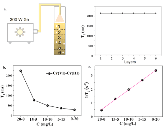 通过光还原过程,高毒性的Cr(VI)可以在TiO 2、ZnO、CdS和MoF等光催化剂上还原为低毒的Cr(III),这可以被视为一种简单、清洁和方便的策略。通常认为溶液中铬的光还原是一个均匀过程。然而,在真实的宏观反应系统中,光还原过程中经常发生沉淀和分层。因此,反应系统中的光还原过程比均相反应系统中的光还原过程更加复杂。深入了解不同深度反应系统中的光还原过程,可以极大地促进高性能光催化剂的设计。如何在不同深度上监测反应系统中的光还原过程引起了该领域的许多研究兴趣,低场核磁共振技术在这一过程中展示了极大的应用潜力。