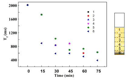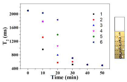 图2 根据照明时间绘制样品不同层的横向弛豫时间(T 2)。实验中使用了Pt/CN光催化剂。实验条件:光催化剂重量¼5 mg,六价铬浓度¼20 mg/L,全波段光照射。
