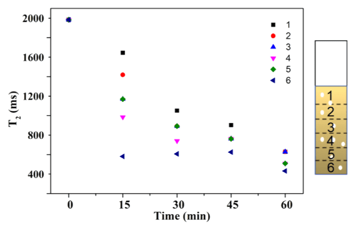 铬(VI)(Cr(VI))是一种有毒金属离子,广泛存在于工业废水中。为了减少六价铬的污染,在过去几十年中,人们开发了许多将六价铬光催化还原为三价铬的技术。然而,由于废水处理过程中催化剂颗粒的沉积和分层,复杂的光还原过程往往阻碍了光催化剂在废水处理中还原Cr(VI)的实际效果。探索和理解催化剂颗粒的沉积和分层对光还原过程的影响是该领域的长期挑战。在此,本案例证明了这个问题可以通过使用低场核磁共振弛豫分层测试方法来解决。以顺磁性Cr(III)阳离子为分子探针,通过探测光还原的弛豫时间,成功地监测了Cr(VI)光还原过程。研究和讨论了催化剂沉降和光波长对光催化的影响。结果表明,低场核磁共振弛豫法在研究工业废水处理铬(VI)光还原过程中具有很大的潜力。