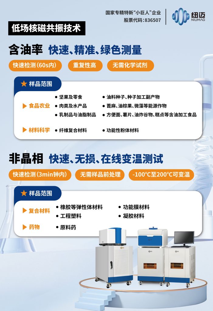 采用低场核磁共振技术,无需前处理、无污染、无破坏,即可实现食品及材料中油脂含量的快速、准确测定。适用于肉类、粮油、高分子材料等多种样品,助力企业提升质检效率,践行绿色检测理念。